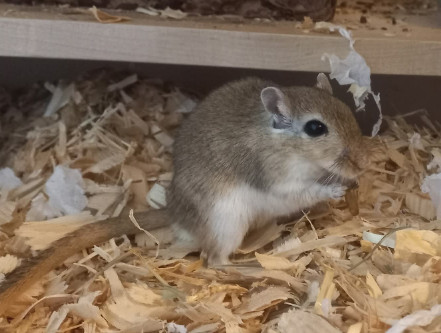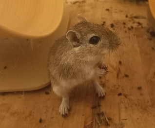 Vorstellung: "Gigi ist seit einem halben Jahr bei uns, leider ist seine kastrierte Partnerin vor Kurzem verstorben. Er ist sehr aufgeweckt und neugierig, läuft gerne und viel im Laufrad, buddelt, mag frisches Frünfutter, geht auf die Hand, hatte noch nie gesundheitliche Probleme und lässt sich sehr viel blicken."