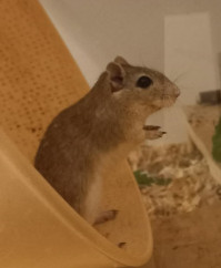 Vorstellung: "Gigi ist seit einem halben Jahr bei uns, leider ist seine kastrierte Partnerin vor Kurzem verstorben. Er ist sehr aufgeweckt und neugierig, läuft gerne und viel im Laufrad, buddelt, mag frisches Frünfutter, geht auf die Hand, hatte noch nie gesundheitliche Probleme und lässt sich sehr viel blicken."